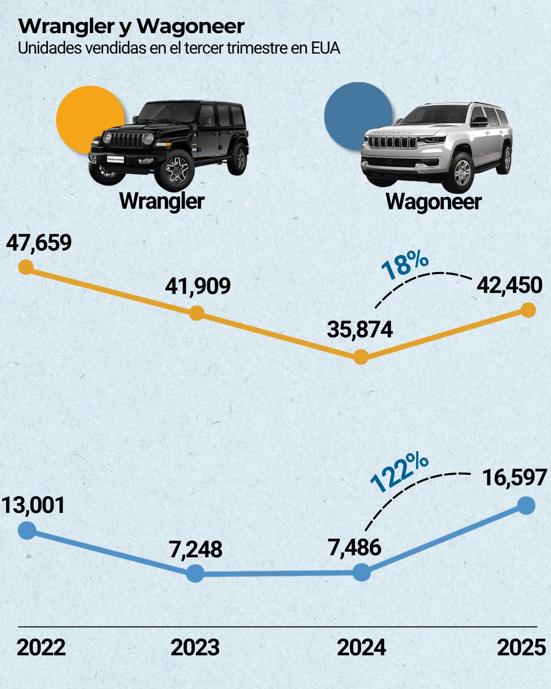 El repunte vino principalmente de Norteamérica, donde las entregas subieron 35% gracias al desempeño de Jeep, que elevó 122% las ventas del Wagoneer y 18% las del Wrangler. En Europa, el avance fue más moderado, con un incremento del 8%, aunque suficiente para sostener el ritmo de recuperación.