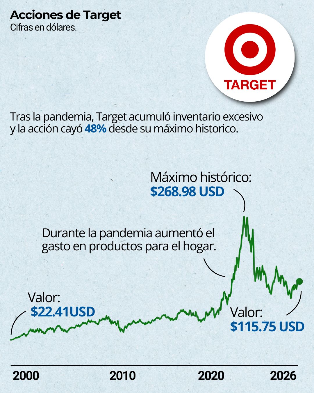 Target planea invertir $1,000 millones de dólares en su cadena de suministro, tecnología y tiendas, después de haber recortado 1,800 empleos corporativos en octubre. Un punto positivo ha sido el crecimiento de más del 30% en entregas el mismo día, mientras la compañía espera que sus ventas vuelvan a crecer alrededor de 2% este año.