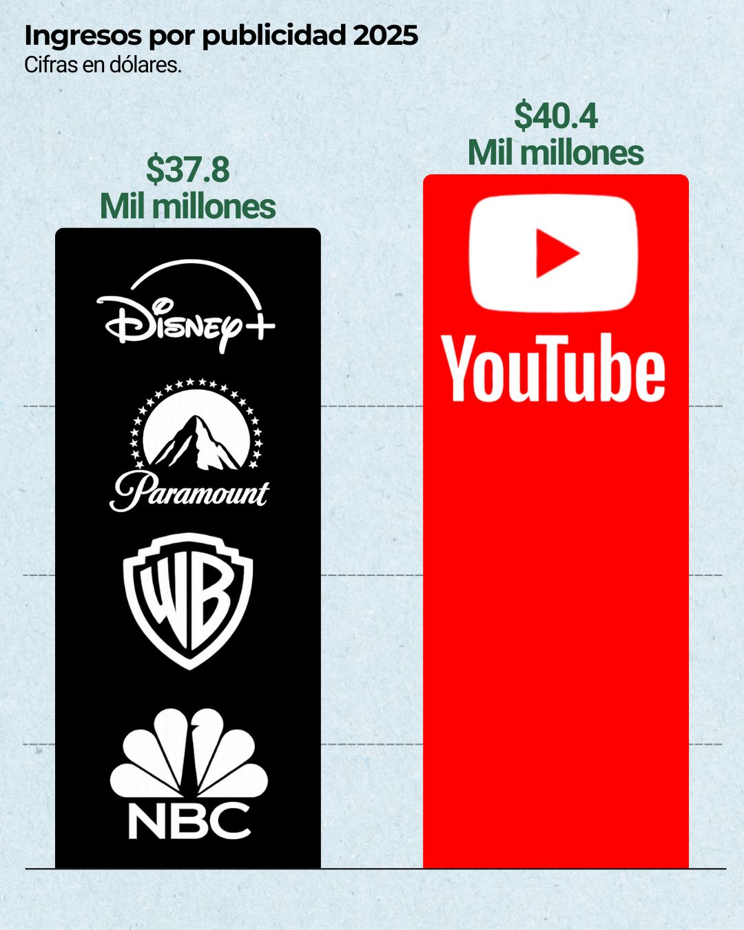 YouTube habría superado los $40,400 millones de dólares en ingresos por publicidad durante 2025, una cifra mayor a lo que generaron juntos Disney, NBC, Paramount y Warner Bros en ese mismo negocio.